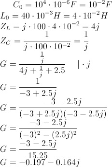 \( C_0 = 10^4 \cdot 10^{-6}F = 10^{-2}F\\ L_0 = 40 \cdot 10^{-3}H = 4\cdot 10^{-2}H \\ Z_L = j\cdot 100 \cdot 4\cdot 10^{-2} = 4j\\ Z_C = \frac {1} {j \cdot 100 \cdot 10^{-2} } = \frac{1}{j} \\ G = \frac{\frac{1}{j}}{4j + \frac{1}{j} + 2.5}\ \ \ \ |  \cdot j\\ G = \frac{1}{-3 + 2.5j}\\ G = \frac{-3 - 2.5j}{(-3 + 2.5j)(-3 - 2.5j)}\\ G = \frac{-3 - 2.5j}{(-3)^2 - (2.5j)^2}\\ G = \frac{-3 - 2.5j}{15.25}\\ G = -0.197 - 0.164j \)