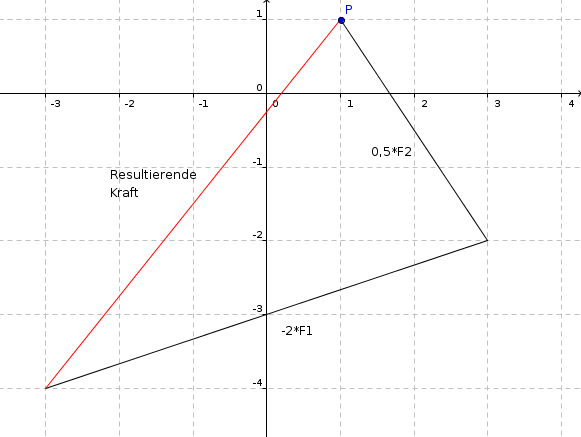 Dann greift in ihm die resultierende Kraft 0,5 * F2 - 2 * F1 = (2; -3) - (6; 2) = (-4; -5) an.